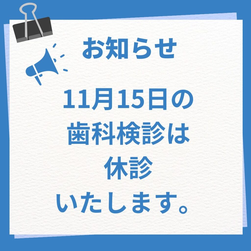 誠に勝手ながら、11月15日(土)の歯科検診は休診とさせていただきます。