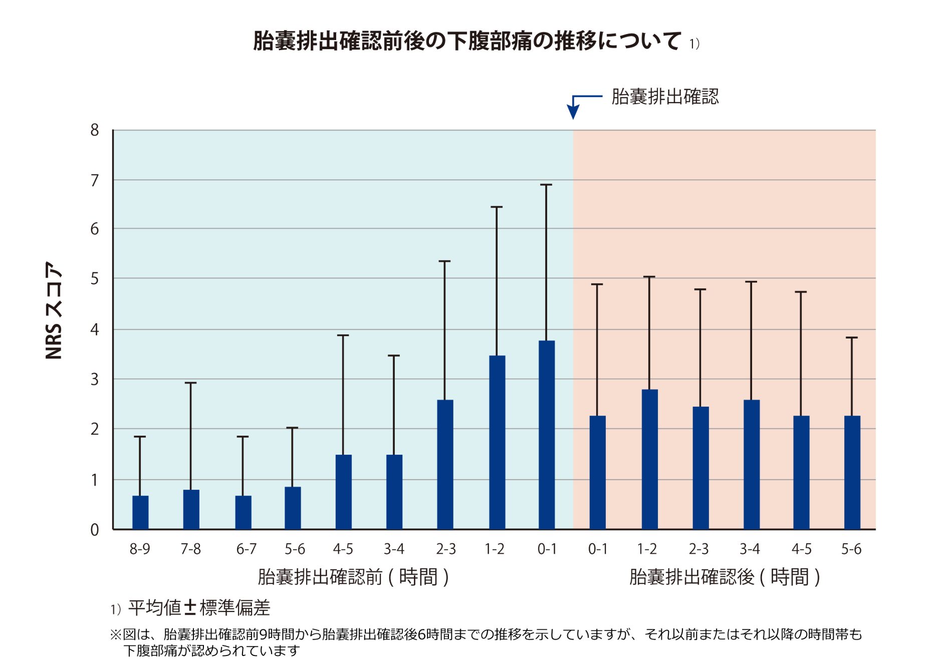 臨床試験では、胎嚢排出確認前1~2時間から下腹部痛が強くなり、胎嚢排出確認前0~1時間では、最も強くなりました。胎嚢排出確認後0~1時間では痛みはわずかに減少しましたが、その後も痛みが継続した症例が一定数みられました。